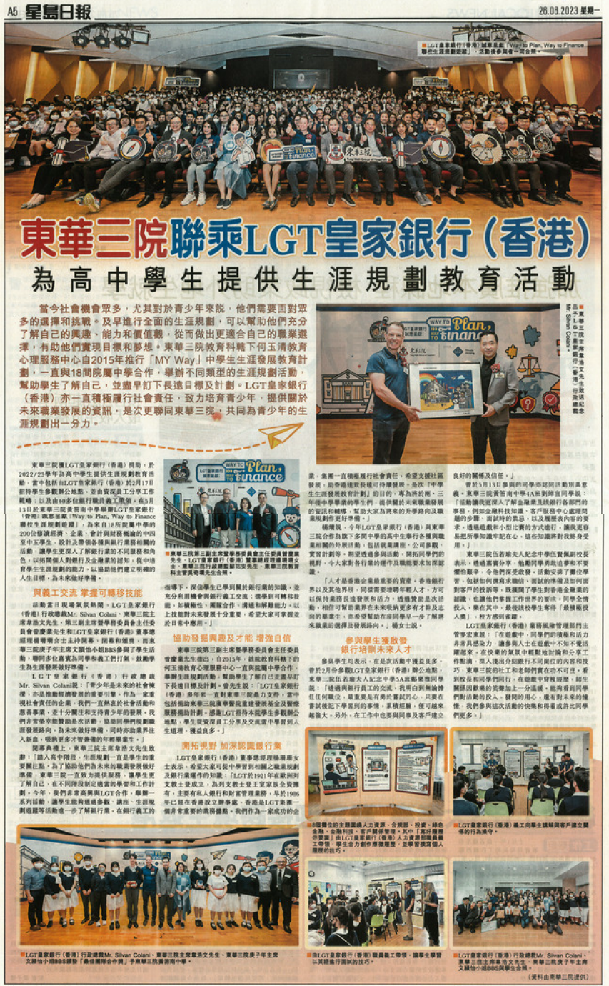 | 東華三院聯乘LGT皇家銀行 | 東華三院聯乘LGT皇家銀行為高中學生提供生涯規劃教育活動 | 26/06/2023 | 星島日報 |