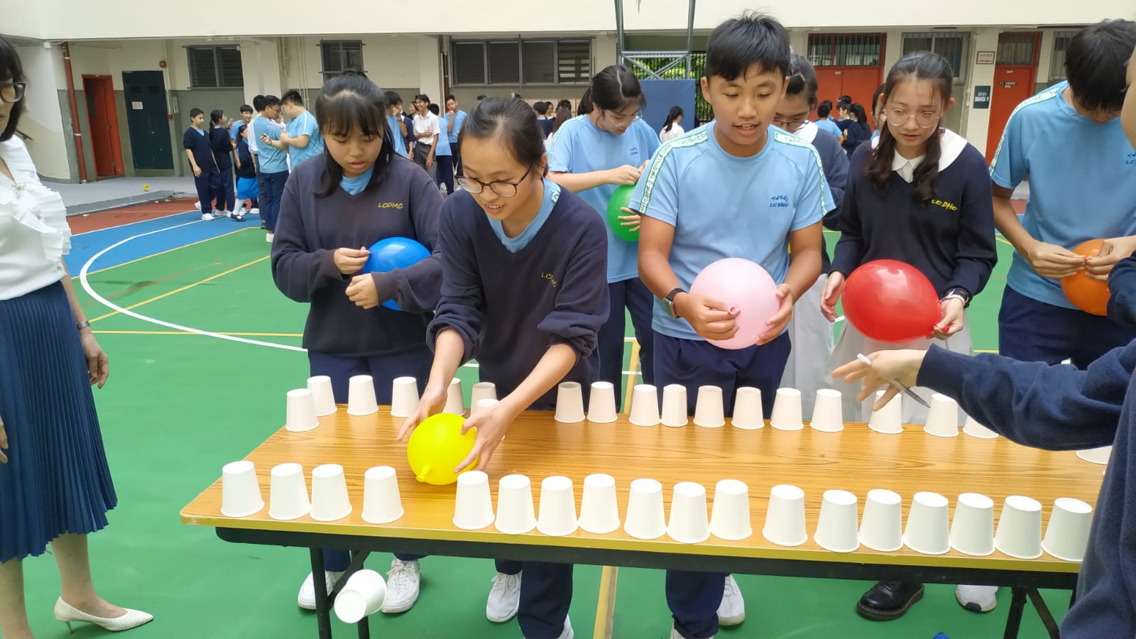 四社Fun 氛分 由課外活動處舉辦比賽給四社同學參加,比賽包括醜小鴨賽跑、大肺王氣球吹杯子及數字球,同學投入比賽。 The Extra-curricular Activities Group organized various competitions for students of the four houses. The students participated in the competitions strived to achieve success for their house. |